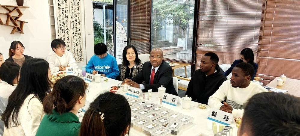 During the visit, Gilles Fagninou also held a cordial discussion with faculty and student representatives from the School of Pharmaceutical Engineering and the School of Design. In a relaxed and enjoyable atmosphere, he joined students in making traditional sachets, experiencing the charm of Chinese traditional culture.